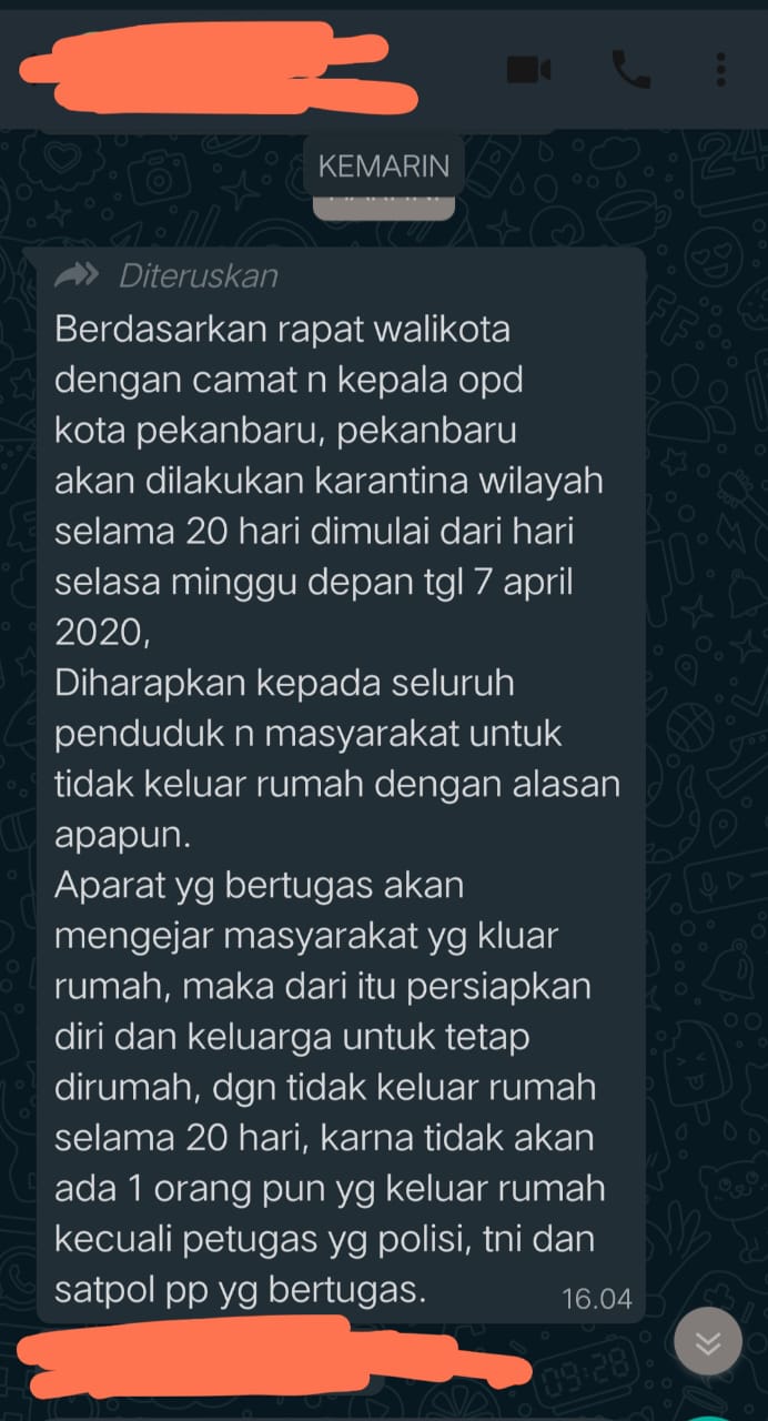 "Informasi itu tidak benar, Pemko Pekanbaru memang merencanakan karantina wilayah, tapi tidak seperti tertanggal dalam pesan itu. Jadi masyarakat tidak perlu resah dan jangan termakan hoax," kata Irba, Rabu,(1/4/2020), malam.