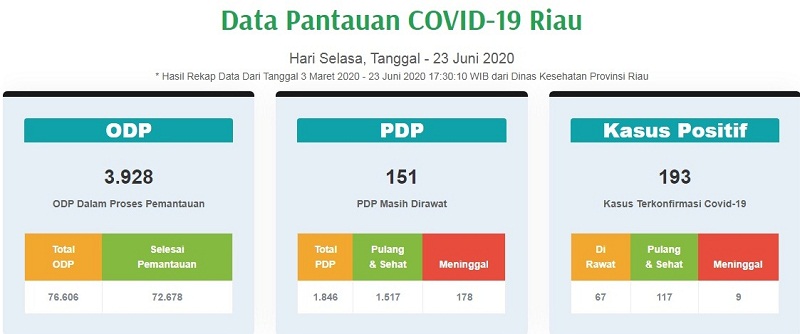 PEKANBARU - Juru Bicara (Jubir) Gugus Tugas Penanganan Covid-19 dr Indra Yovi mengumumkan pasien positif Covid-19 di Provinsi Riau bertambah menjadi 27 orang total menjadi 193, 67 orang masih dirawat, 117 orang sudah dinyatakan sembuh, 9 orang meninggal dunia.