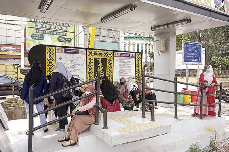 Pantauan Jumat (21/1) di sejumlah halte di Jalan Jenderal Sudirman, Jalan Tuanku Tambusai, hingga Jalan Soekarno Hatta, tampak puluhan calon penumpang menunggu di halte.
