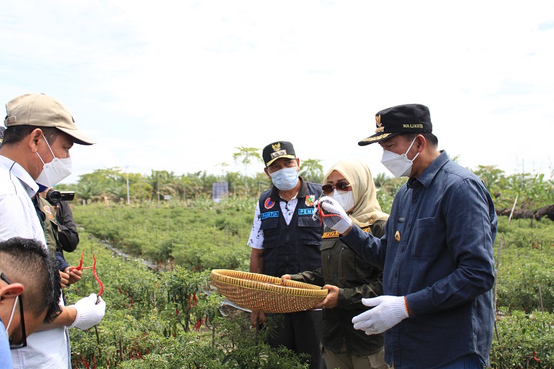 Wali Kota Pekanbaru, Firdaus turut dalam kegiatan memanen cabai di lahan Kelompok Tani Palas Mandiri, Jalan Sejahtera, Kelurahan Agrowisata, Kecamatan Rumbai Barat, Sabtu (20/2/2021). Cabai yang dipanen merupakan jenis baru hasil budidaya beberapa generasi.