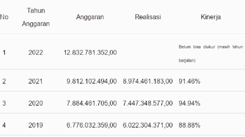 Pada Tahun Anggaran 2021 akun Belanja dialokasikan sebesar 9.812.102.494,00 dan realisasi sebesar 8.974.461.183,00 atau 91.46% dibandingkan dengan realisasi tahun Anggaran 2020 sebesar Rp7.447.348.577,00 dari anggaran yang ditetapkan sejumlah 7.884.461.705 atau setara realisasi sebesar 94.94% atau realisasi naik senilai 23,66% dari tahun 2019 dengan nilai realisasi pada Tahun Anggaran 2019 tersebuat adalah Rp6.022.304.371,00.