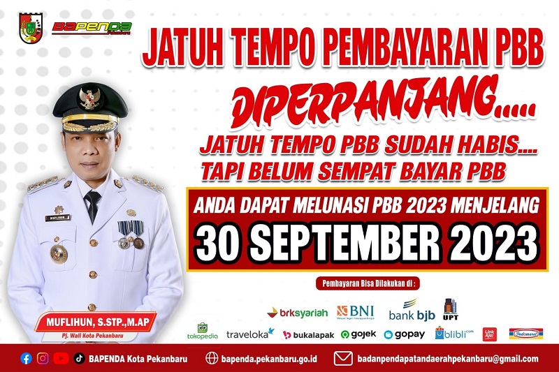 PEKANBARU- Pemerintah Kota (Pemko) Pekanbaru melalui Badan Pendapatan Daerah memperpanjang jatuh tempo pembayaran Pajak Bumi dan Bangunan (PBB) berikut penghapusan denda Tahun 2023 hingga 30 September.