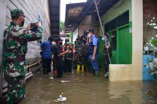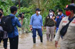 PEKANBARU- Walikota Pekanbaru Firdaus MT meninjau korban yang terdampak banjir di Perumahan Peson.